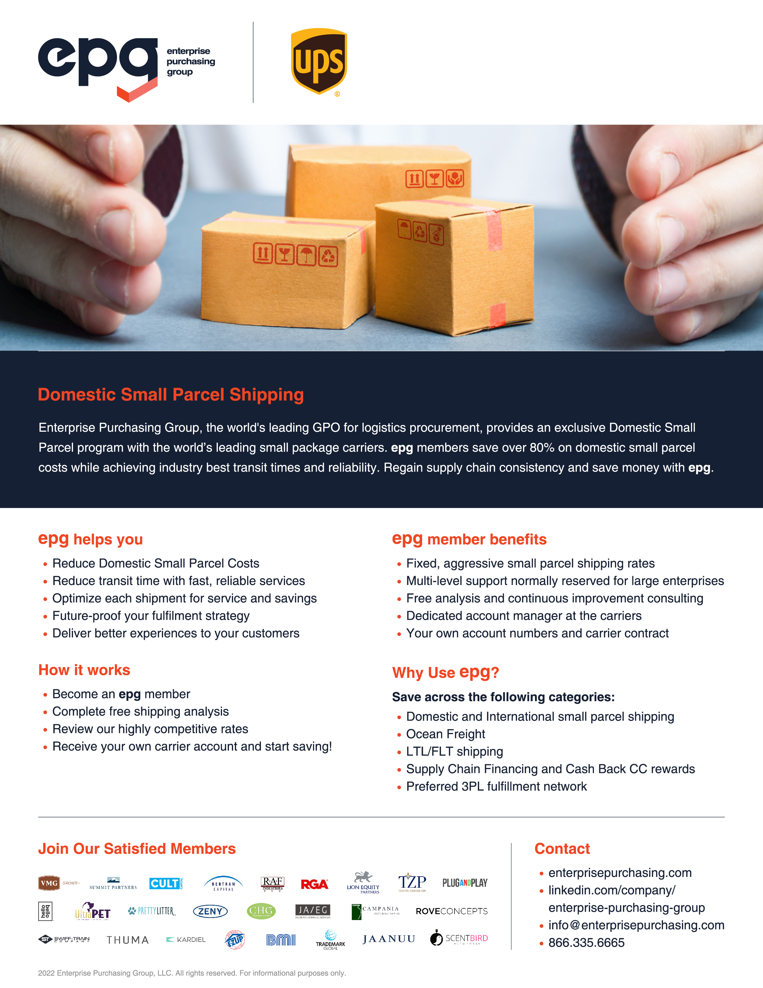 epg is the world’s leading Group Purchasing Organization for e-commerce, logistics procurement and supply chain optimization. Our mission is to support your growth by reducing costs and creating valuable supply chain efficiencies. epg negotiates best-in-category pricing based on billions in purchasing volume and tailors solutions specific to your supply chain needs, addressing the categories you spend most on. Simply put, our business is to make yours more profitable.