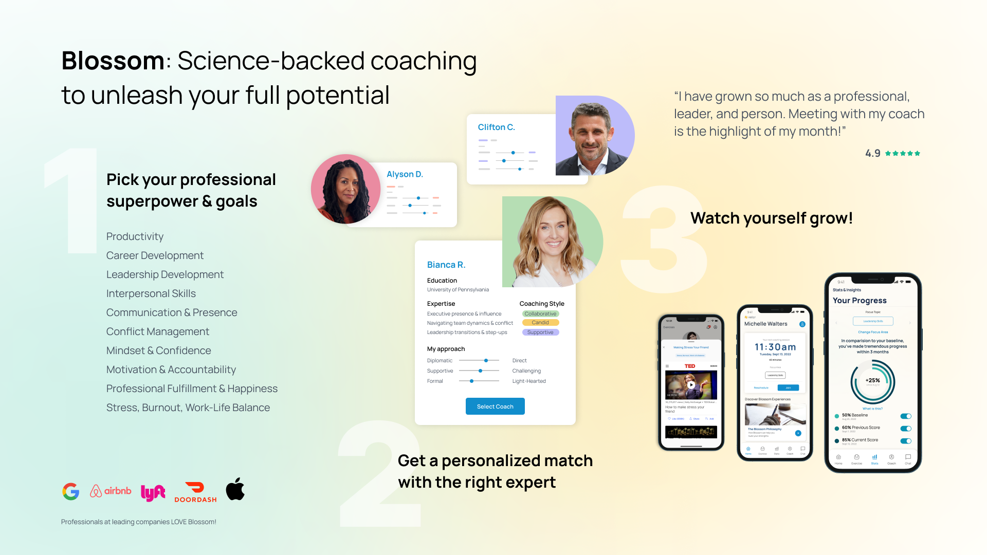 Blossom democratizes access to world-class coaching that high-performing startups use. AI-powered features give founders the best of both worlds – scalable coaching for all employees and cutting-edge progress tracking and insights for leaders.